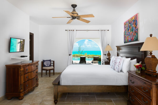 The villa offers spacious common areas with scenic views of the sparkling turquoise waters of Long Bay. The living area includes a flat-screen TV, vaulted ceilings, arched doorways, and elegant French doors that open onto the pool and ocean views. The open dining area overlooks the waterfront and has a table that seats eight.